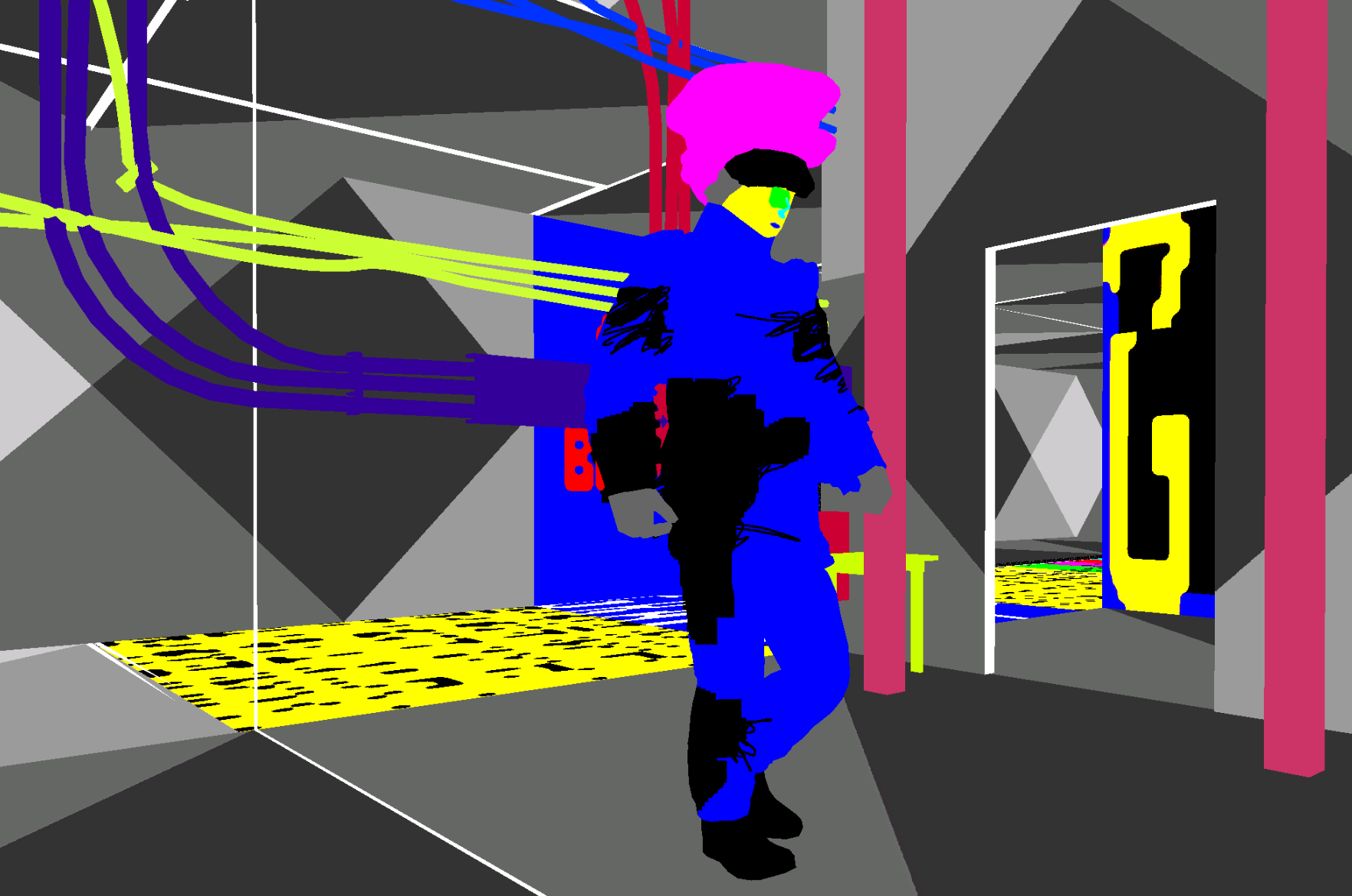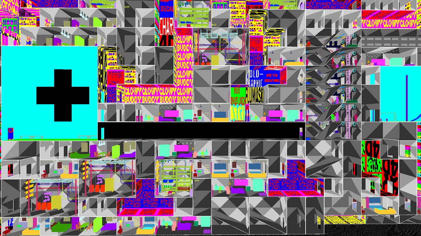 I have been developing Aria Engine in various forms for over a decade. What began as an immersive video installation loosely inspired by Andrei Tarkovsky’s Stalker gradually expanded into a broader cosmology shaped by recursive architectures, decaying social structures, and fictional AI gadgetry. Over a five-year period, I collaborated with Porpentine Charity Heartscape to elaborate this world through the visual and conceptual metaphor of the labyrinth. That motif informed every layer of the project’s design from the intestinal architecture of its protagonist, Aria End, to the unstable spaces in which she labors. This was long before my first interactions with ChatGPT or any other generative model: our worldbuilding practice was slow and speculative, grounded in long conversations, constrained resources, and iterative experimentation with game engines.