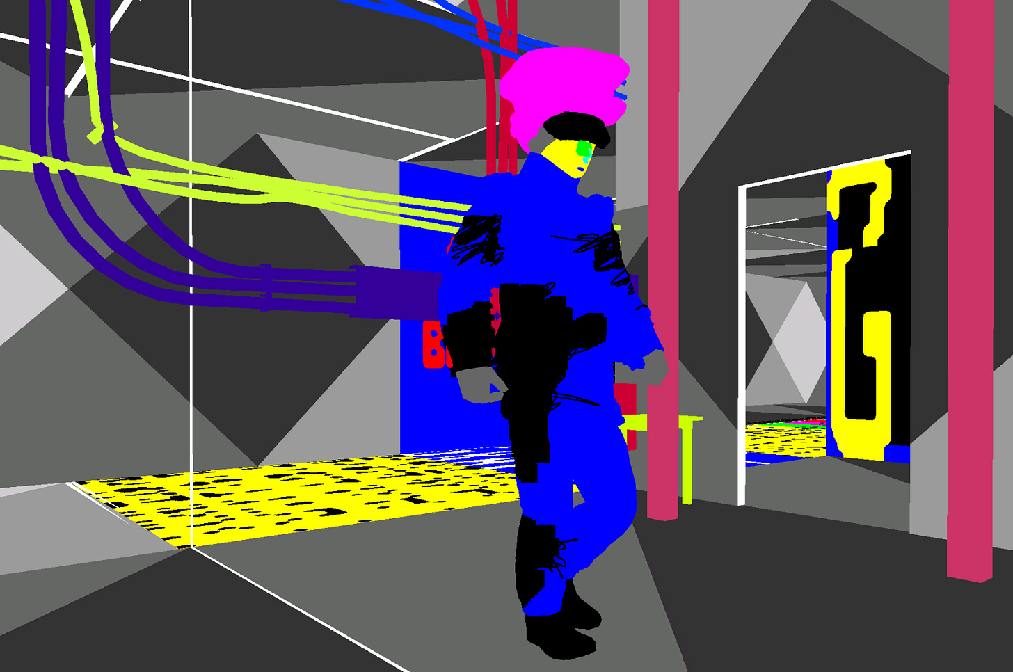 This breakdown of visual and textual belief has made its way into my imaginary world. In Aria Engine, everything is suspect. The architecture shifts. The signage lies. The smart plastic displays glitch like a replicant blinking too slowly. Aria herself receives notifications from a system that no longer knows who she is. Her STOMA tells her to smile when she's in danger, to sleep when the walls are on fire. The infrastructure is gaslighting her.