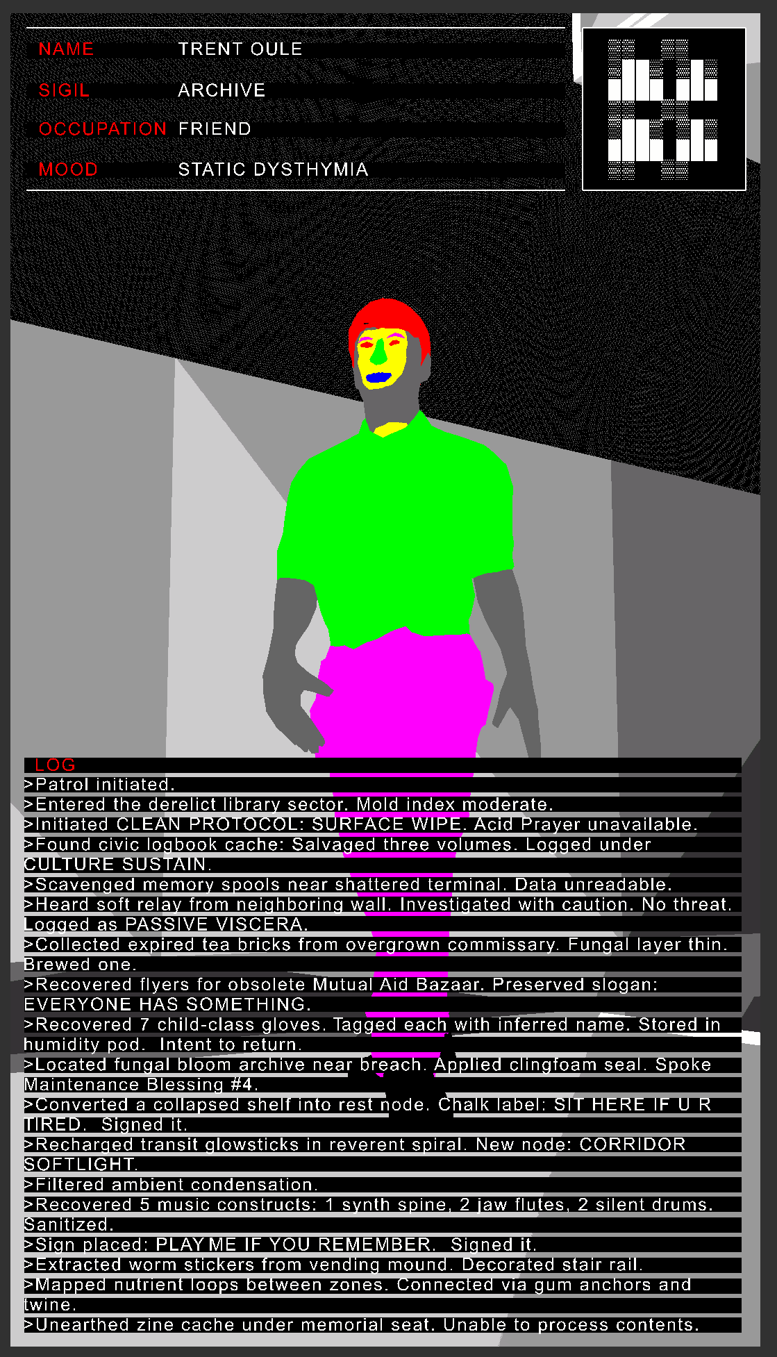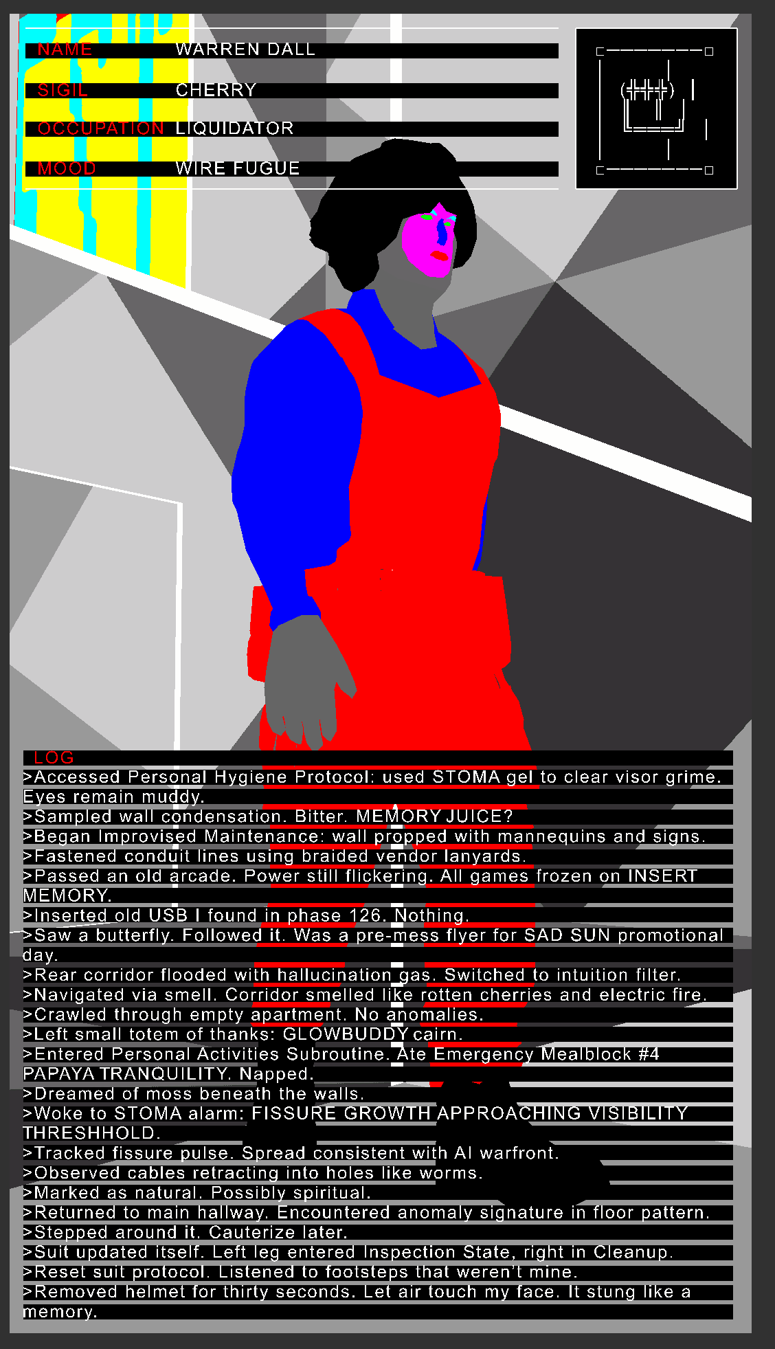 These characters live within the world of Aria Engine, a computer simulation of a decaying underground smart-building where every form of life is governed by fictional AI entities. At the center of this world is Aria End, a sick girl with a cyborg gut whose emotional regulation is outsourced to a malfunctioning neural implant. Aria was born out of a collaboration with Porpentine Charity Heartscape nearly a decade ago, long before I began working with generative AI. Her story was always about survival through adaptation, a meditation on illness and resignation. More recently, I began using AI to expand her world, populating it with new entities like the Planners, Liquidators, and Worm Cubers. These characters did not exist until I typed something vague into a web interface and the model hallucinated their husks to life. Then I refined it, shaped it, and claimed it. What once felt like a clear demarcation between tool and author now appears as a tangle where origin and influence blur.
